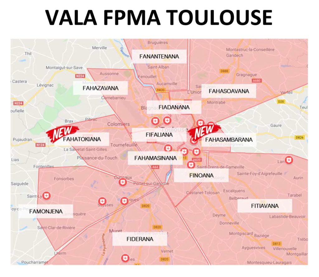 Ny mpiangon’ny FPMA Toulouse misoratra aradalàna ao anaty bokim-piangonana dia notsinjaraina anaty « Vala », araka ny faritra jeografika ipetrahany.